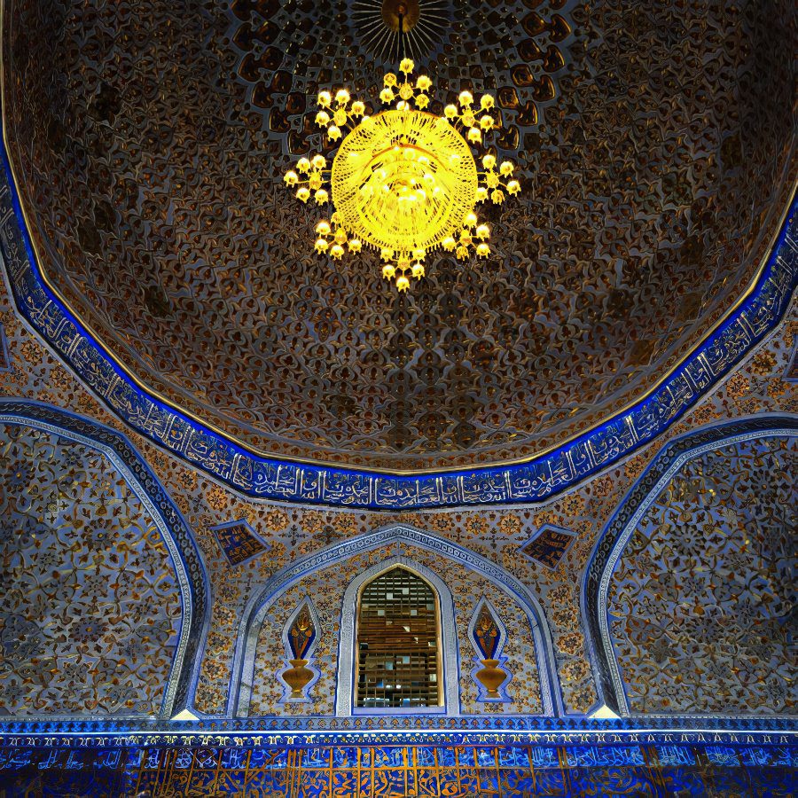 Снаружи — сине-голубая мозаика, внутри — вечная ночь. Встав на холодные плитки оникса, поднимаешь голову и теряешь ощущение пола: свод расписан так, чтобы напоминать зимнее звёздное небо 1404 года; золотые жилки орнамента вспыхивают, как Млечный Путь, а ухо ловит мягкое четырёхкратное эхо, рассчитанное древними мастерами «под число праведных халифов».