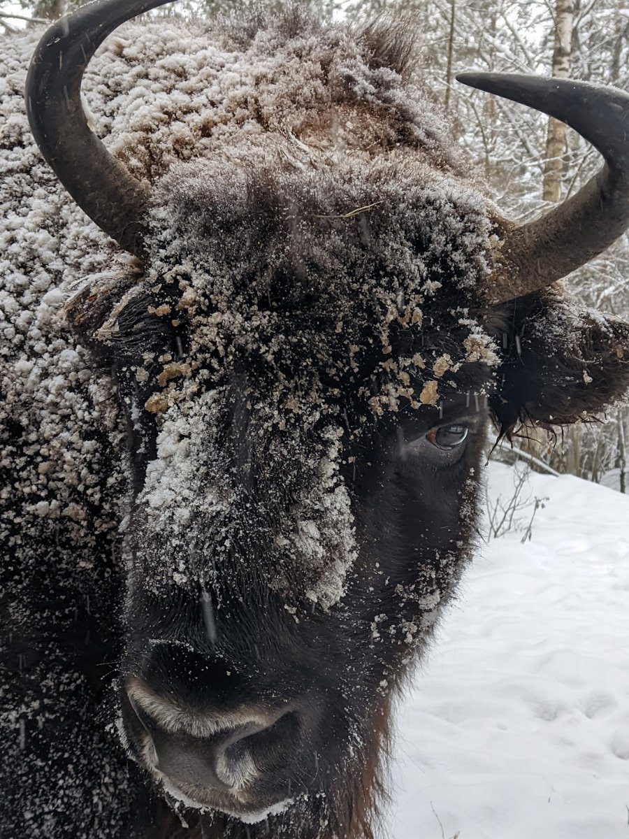 Но мы не сразу пошли в музей. Первым делом — к зубрам. Это главное зимнее развлечение в национальном парке «Угра». Дело в том, что гарантированно увидеть зубров в дикой природе можно только с декабря по март, когда лежит снег. В тёплый период, после схода снега, зубры уходят глубоко в леса, и найти их там практически нереально.