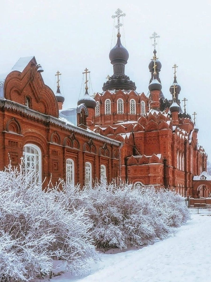 Территория ухоженная. Здания из красного кирпича в едином стиле конца XIX века. Казанский собор впечатляет масштабами даже зимой, когда всё засыпано снегом. Зашли внутрь. Тепло, тихо. Горят свечи. Несколько монахинь, в основном пожилые.